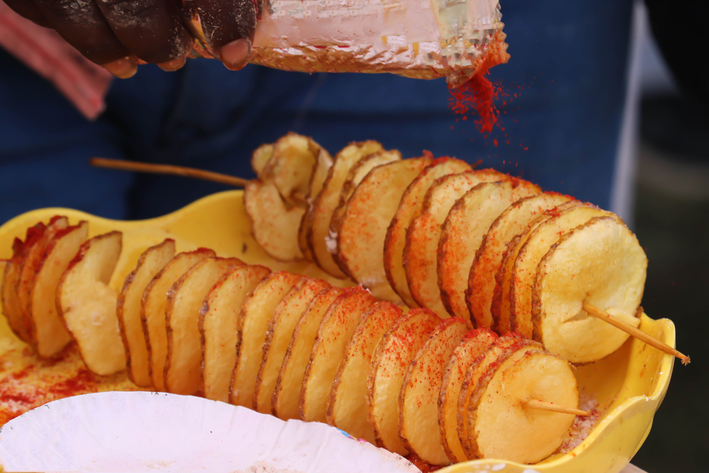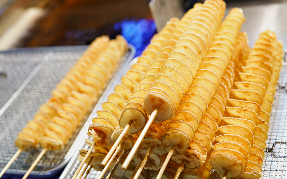 Modo de preparo: Cortar as batatas descascadas em retângulos longos. Cortar fatias verticais até a metade de um lado. Do outro lado, cortar fatias diagonais até o meio. Colocar as batatas em uma tigela de água para enxaguar. Retirar da água e escorrer, depois colocar nos espetos. Aquecer o óleo, fritar as batatas até dourar e servir.
